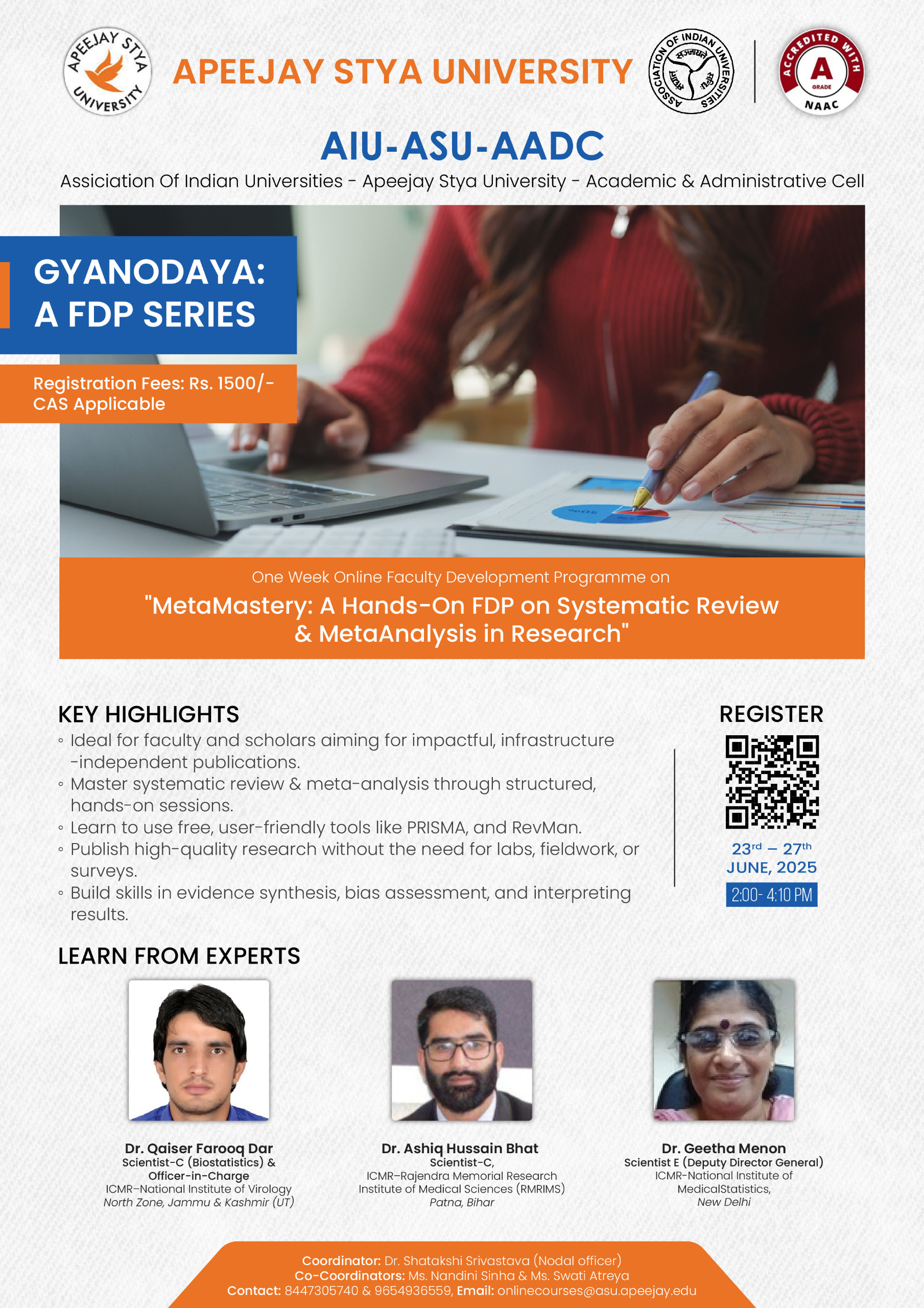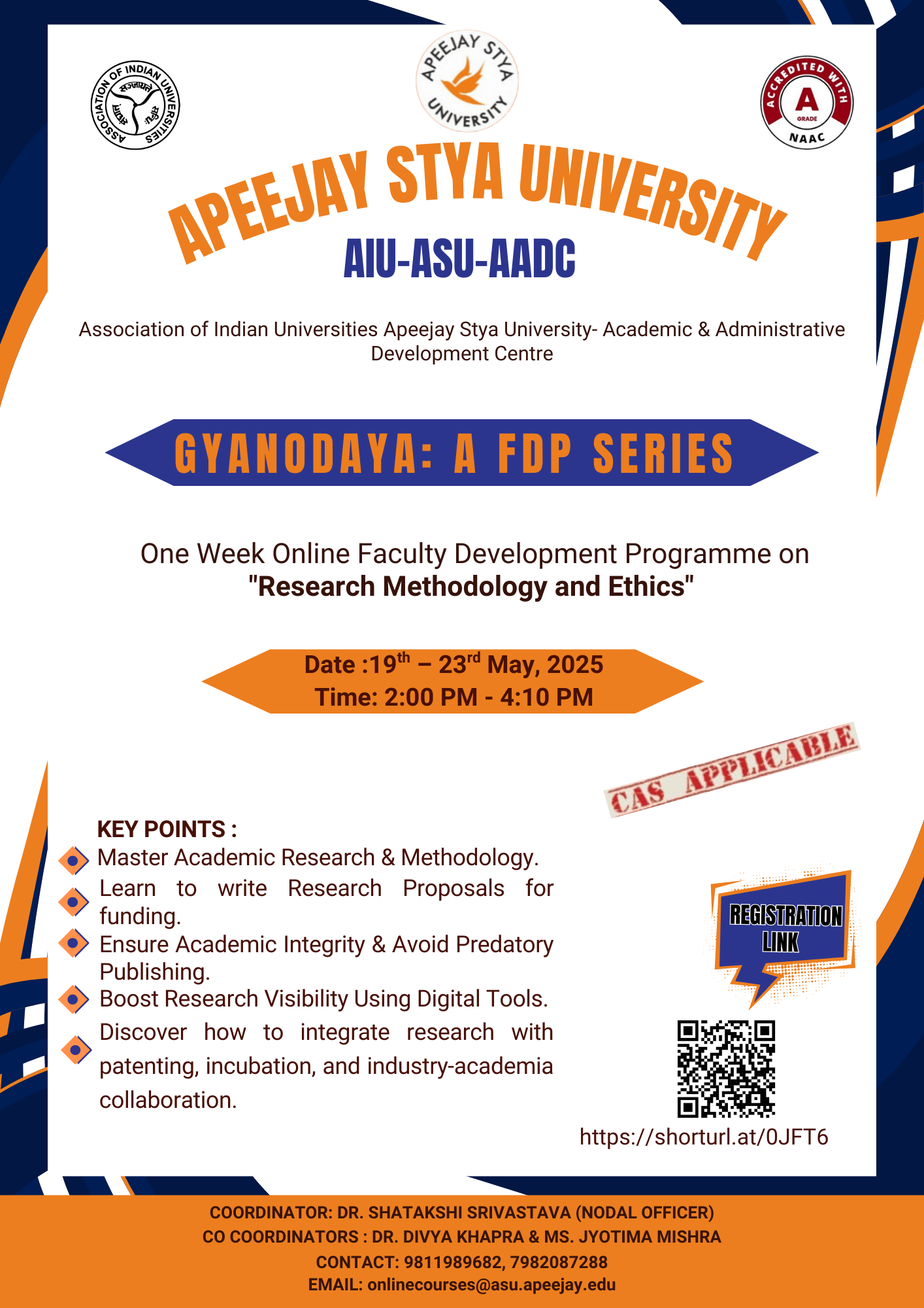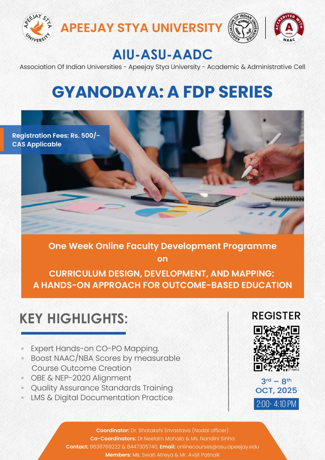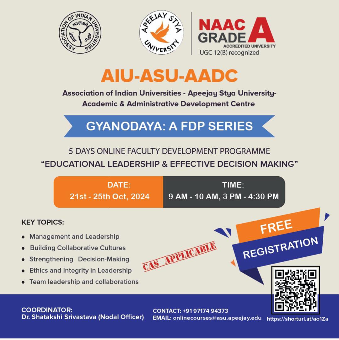 | 1 | Apeejay Stya University, Haryana | GYANODAYA: A FDP Series. FDP on “Curriculum design, Development & Mapping: A Hands-on approach for Outcome based Education” | 3rd- 8th Oct 2025 | Flyer |