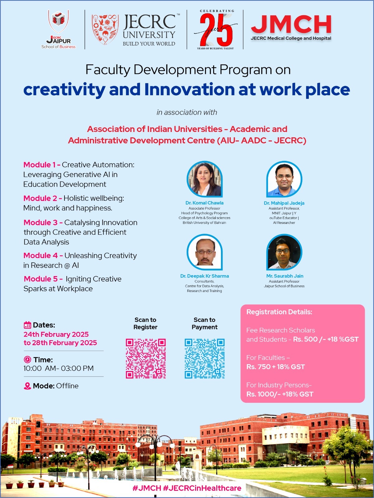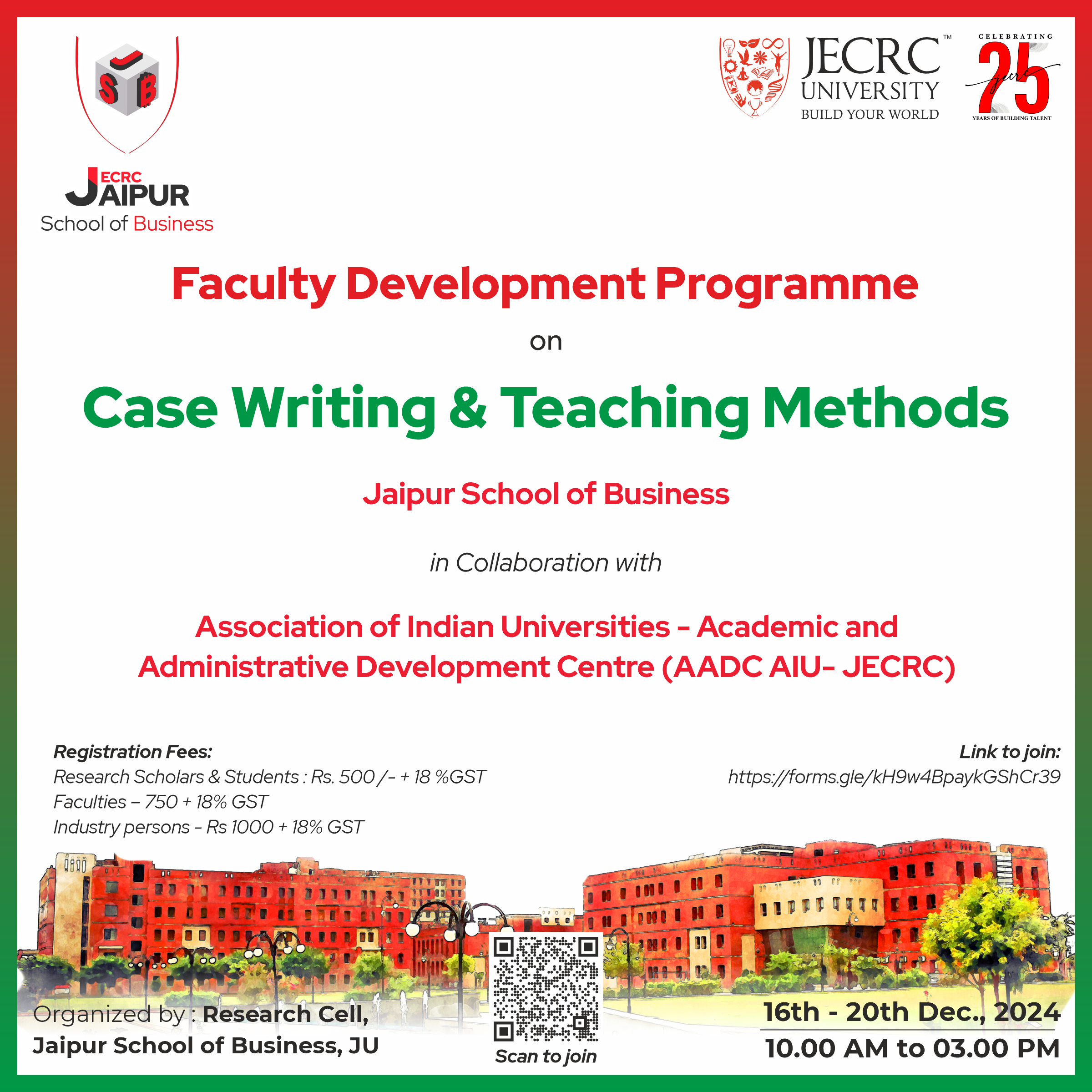 | 1 | Amity University, Rajasthan | Faculty Development Program on: “Enhancing Research Skills: From Design to Publication” | 07th July 2025 – 11th July 2025 | Report |
