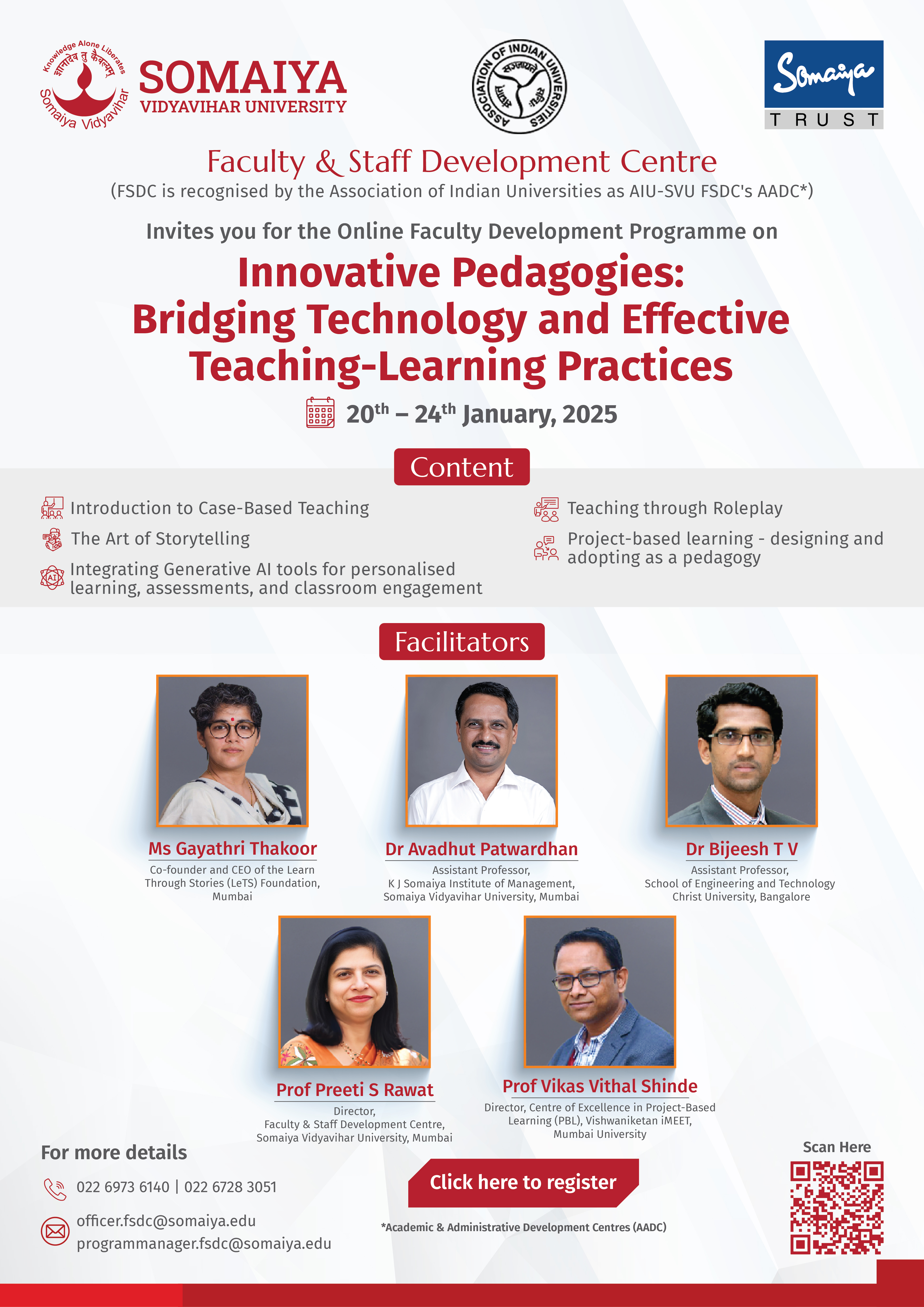 | 2 | Somaiya Vidyavihar University (SVU) in Mumbai, Maharashtra | FDP in “Technology-enabled Learning (TEL), and Blended Learning” | January 13 to 17, 2025 | Report |