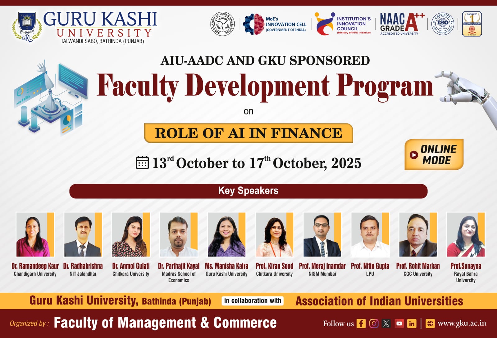 | 2 | Guru Kashi University, Bathinda | FDP on Roles of AI in Finance | 13.10.2025 to 17.10.2025 | Flyer Schedule |