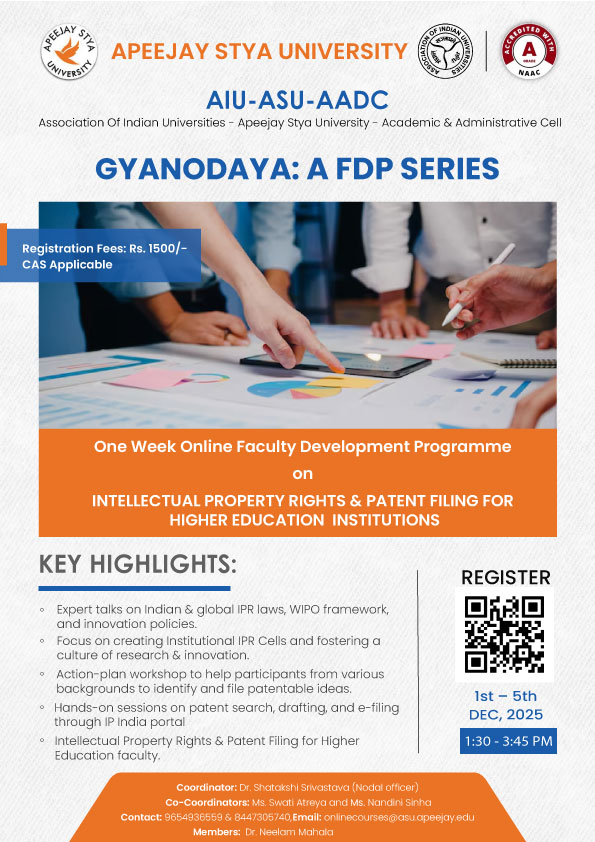 | 2 | Apeejay Stya University, Haryana | GYANODAYA: A FDP Series. FDP on “Intellectual Property Rights and Patent Filing in Higher Education Institutions” | 1st to 5th December 2025 | Flyer |