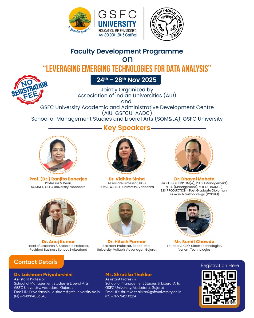 | 3 | GSFC University, Vadodara, Gujarat | FDP on Leveraging Emerging Technologies for Data Analysis – | 24th-28th November 2025 | Brochure Flyer Report |