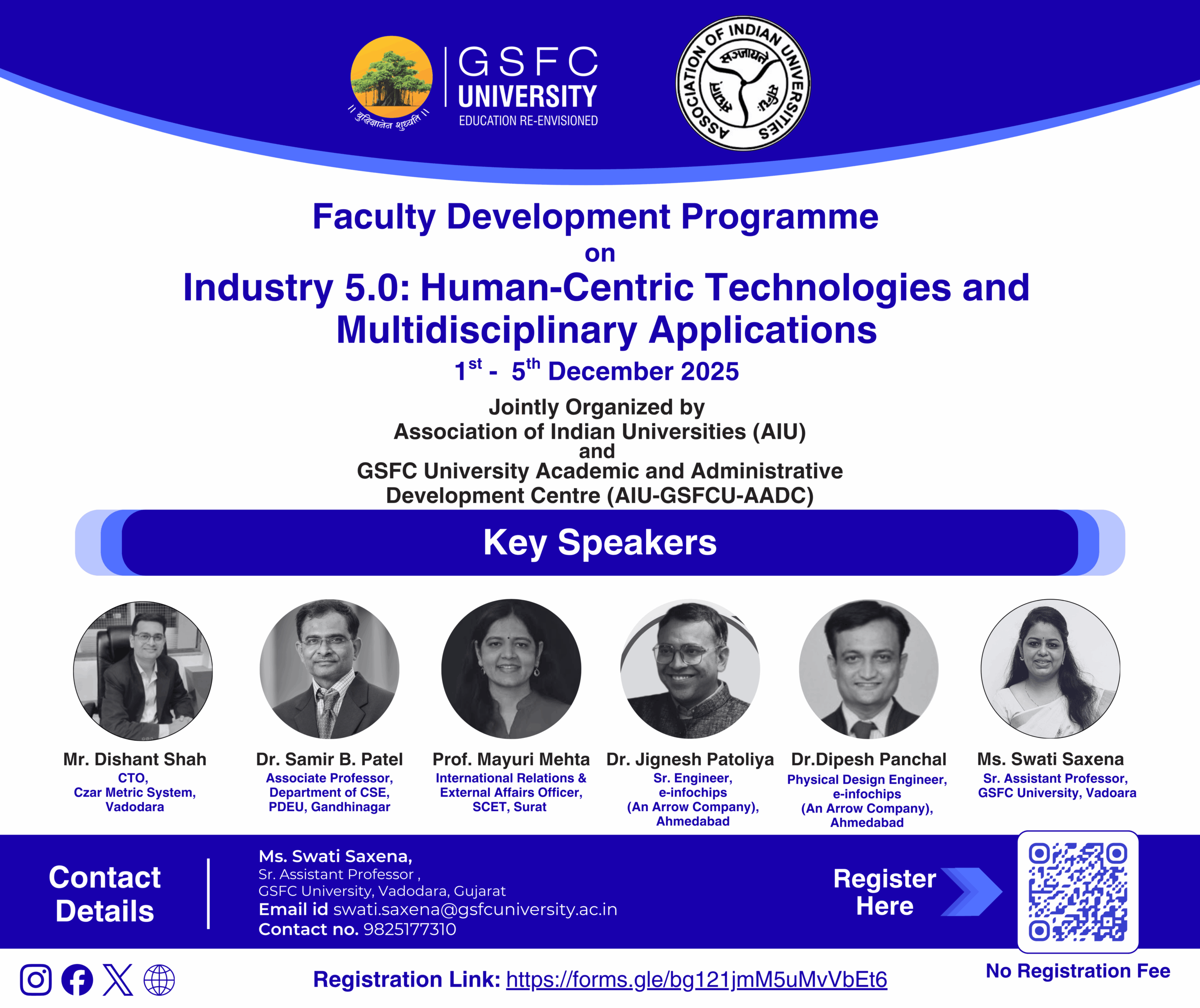 | 4 | GSFC University, Vadodara, Gujarat | FDP on Industry 5.0: Human-Centric Technologies and Multidisciplinary Applications | 1st -5th December 2025 (Hybrid) | Brochure Flyer Report |