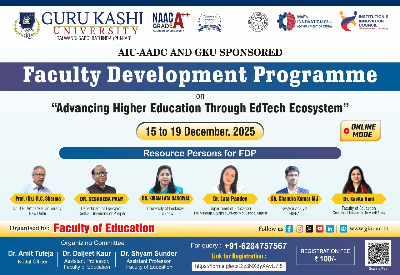 | 3 | Guru Kashi University, Bathinda | FDP on Advancing Higher Education Through EdTech Ecosystem | 15.12.2025 to 19.12.2025 | Flyer Schedule |