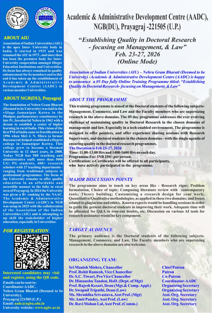 | 2 | Nehru Gram Bharati University | 05 days fully online training program on “Establishing Quality in Doctoral Research- focusing on Management & Law“ | 23-27th February, 2026 (Online) | Brochure |