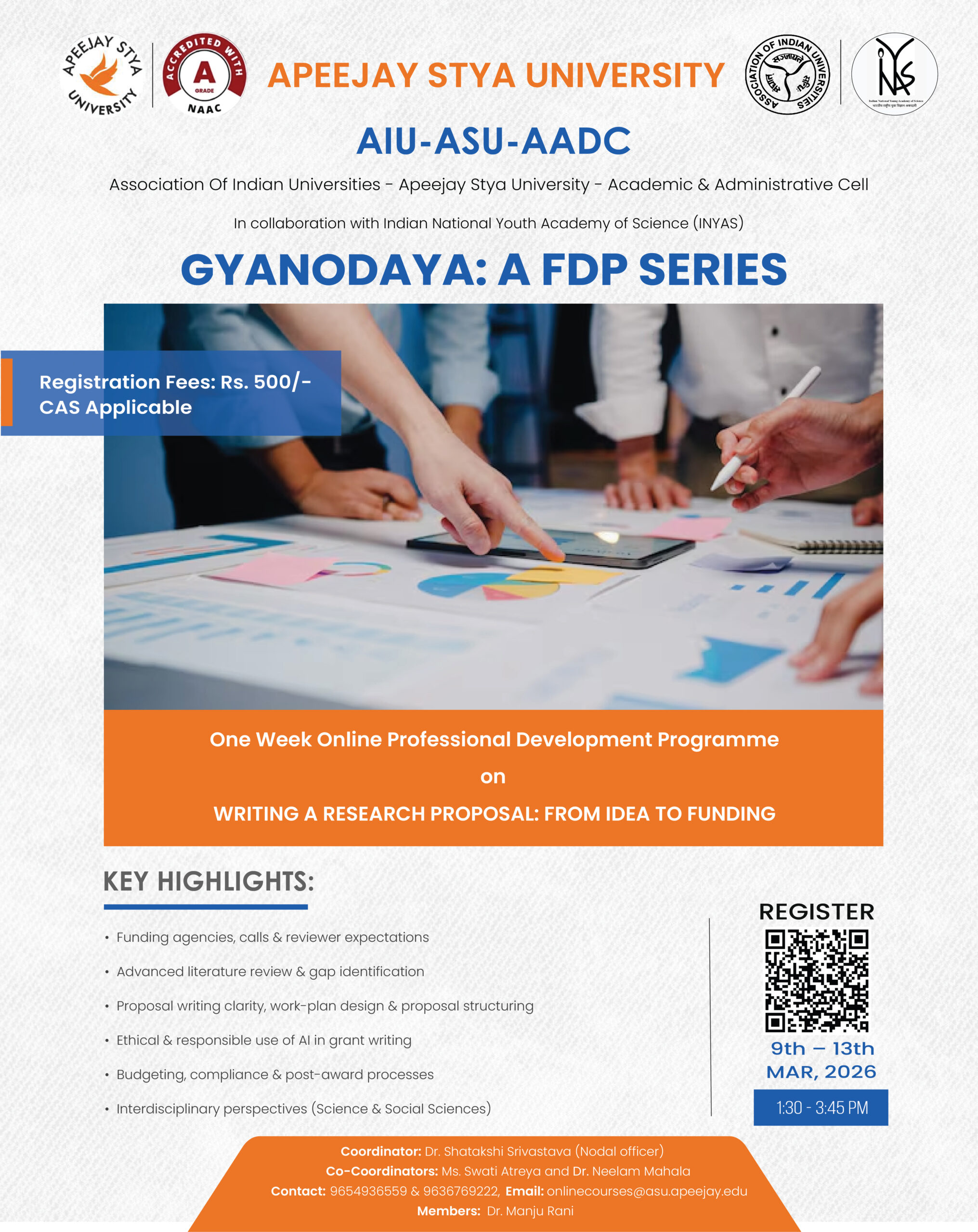 | 3 | Apeejay Stya University, Haryana | Professional Development Programme (PDP) on “Writing a Research Proposal: From Idea to Funding” | 9th to 13th March 2026. | Brochure Registration |